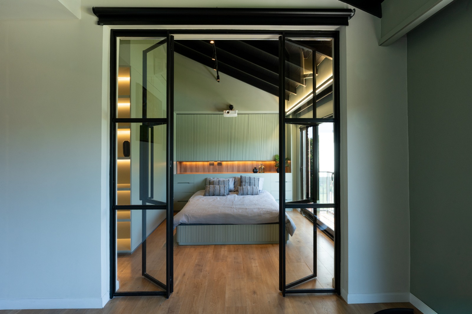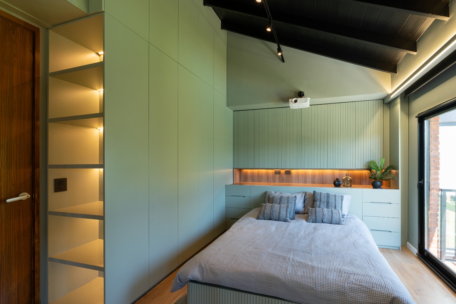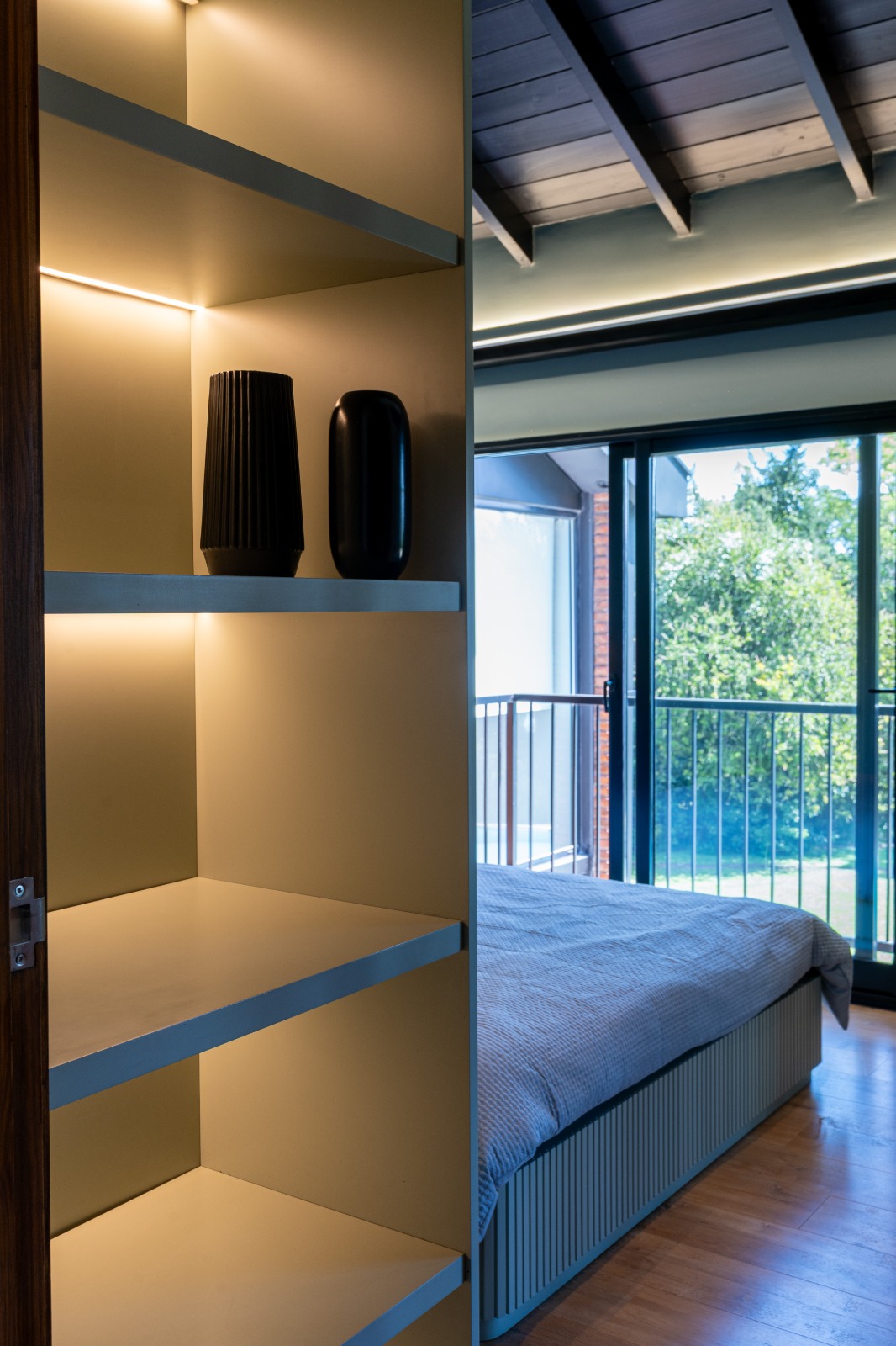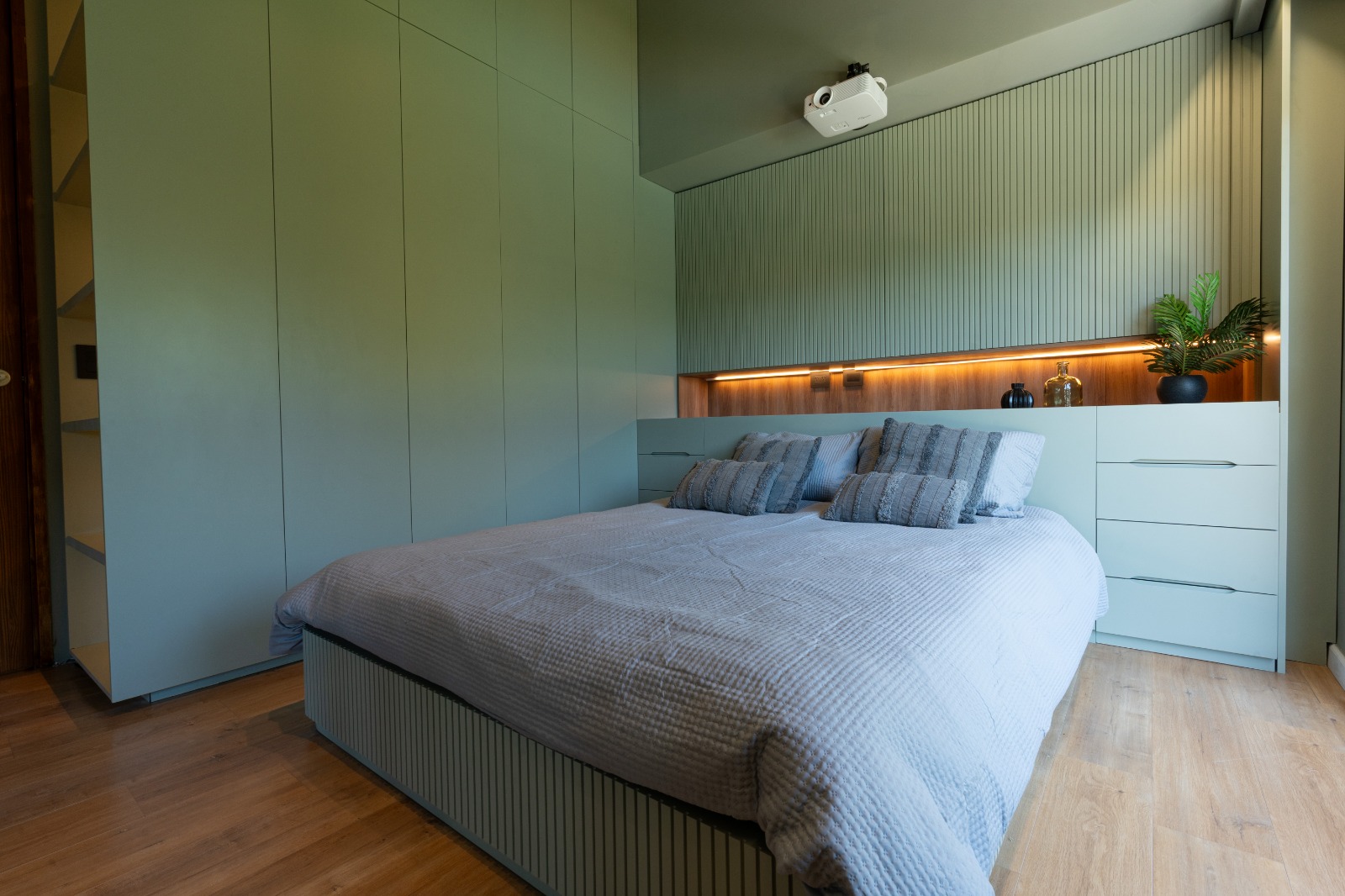El respaldo de cama está diseñado de pared a pared ayudando a ampliar el espacio
