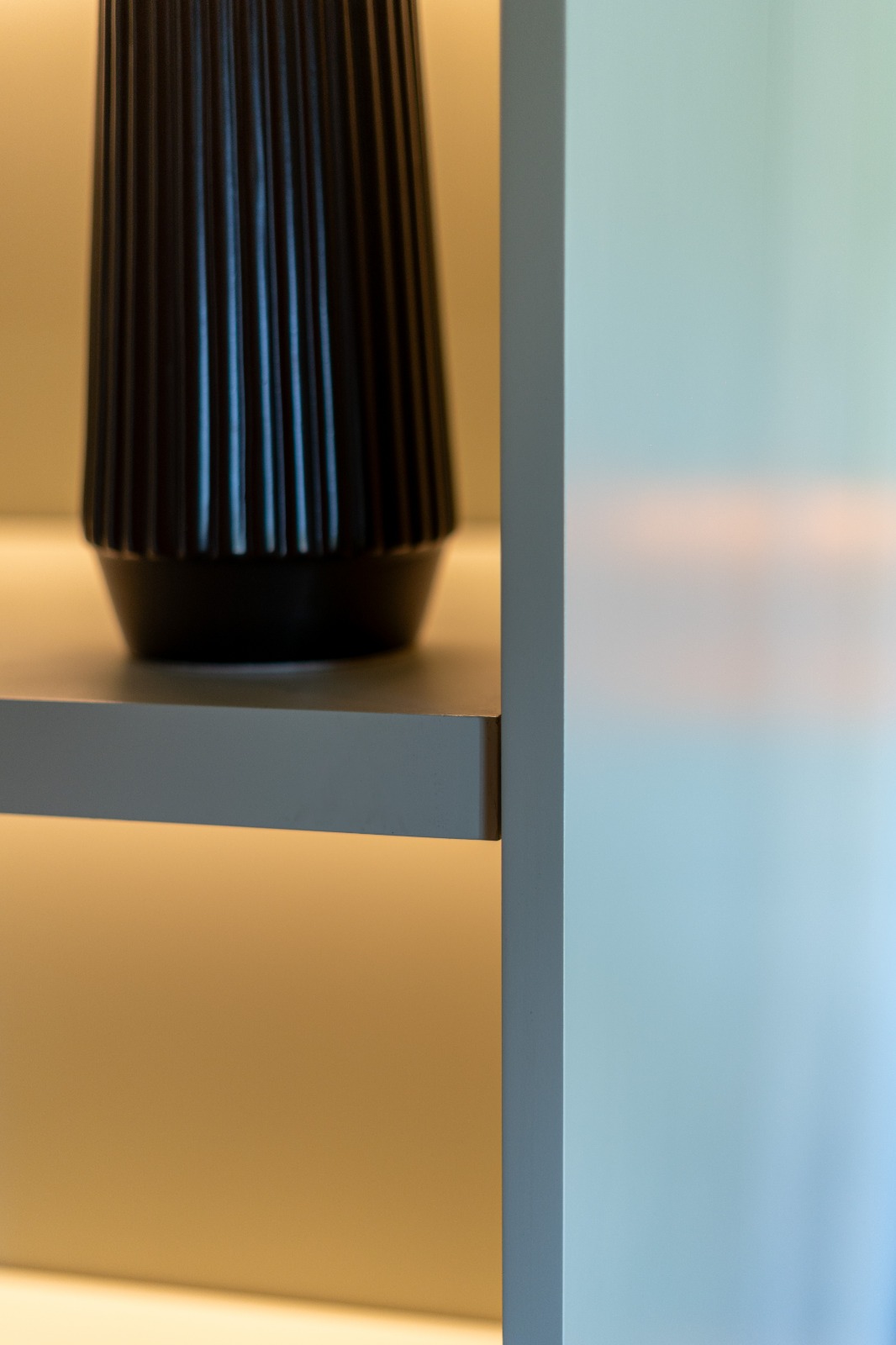 Los clientes destacaron el amplio espacio para calzado y prendas, por lo que incorporamos bandejas con guías telescópicas y un barral de aluminio cromado.